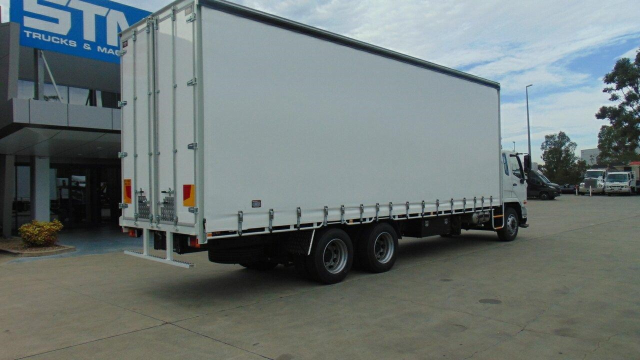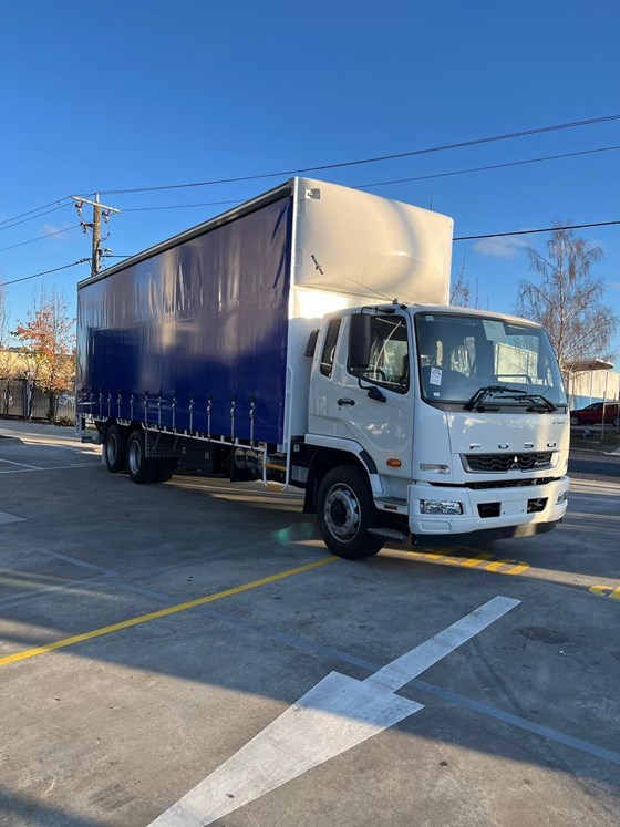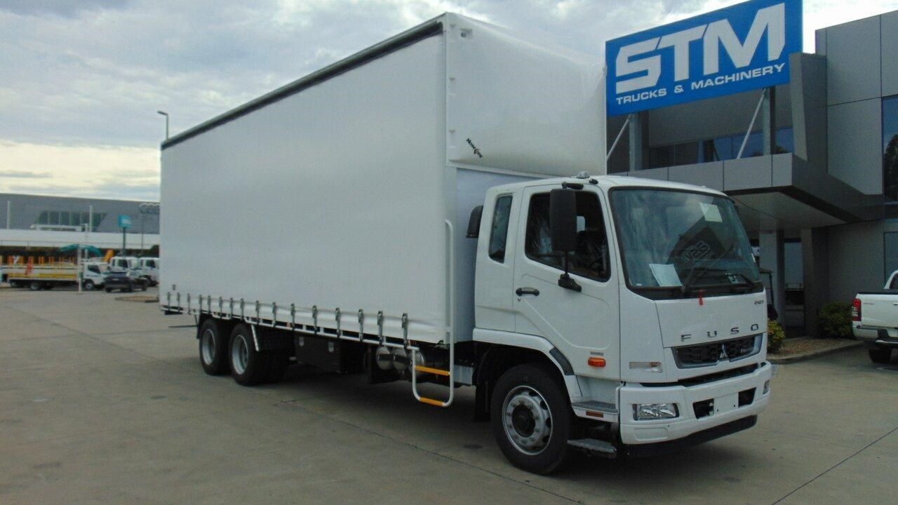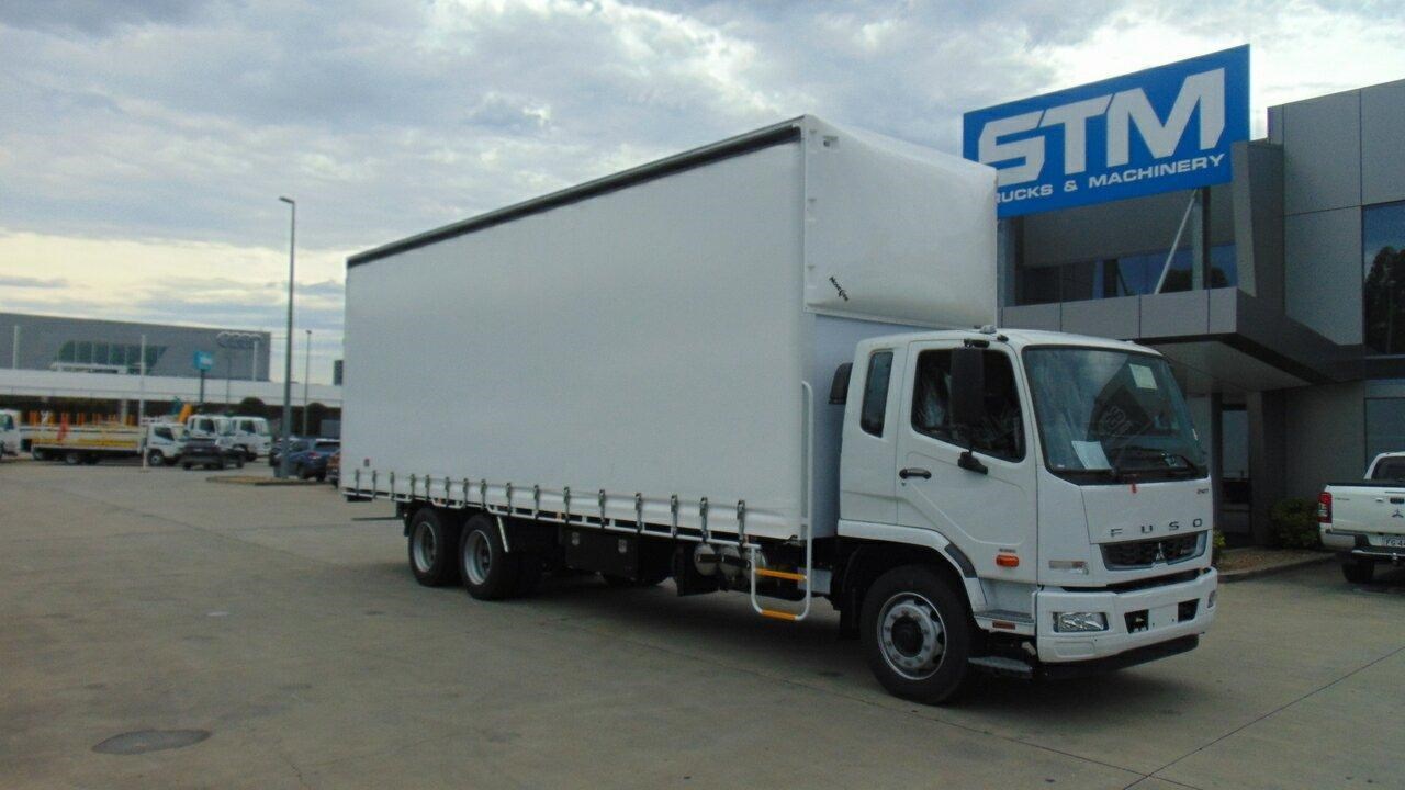 2025 Fuso 2427 Fighter White Curtain Sider 7.5l 6x2 - NOTE: Plus on road costs. 2025 Model Fighter 2427 6 speed Allison Automatic, 14 pallet tautliner, barn rear doors. Load restraint curtains, Strap and Go system, 7 winches on track, 1200mm Black toolbox Call the new Fuso Sales team to arrange an inspection