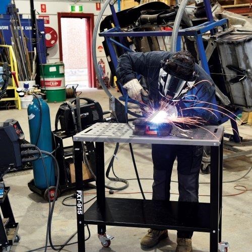 The FXT-915 Fixture Table is a versatile solution for any home workshop. The table is designed with a solid 3mm steel top complete with 16mm holes to accommodate welding table clamps or jigs for easy set-up for welding, grinding or as a mobile work surface, whilst the steel lower shelf gives you convenient storage for your welder or other tools. The table features heavy 50 x 50 x 4mm angle steel legs giving it a large 500kg load capacity along with heavy duty swivel castors allow for easy mobility so when you have completed your job and need the floorspace, unlock the casters and simply move the table away!