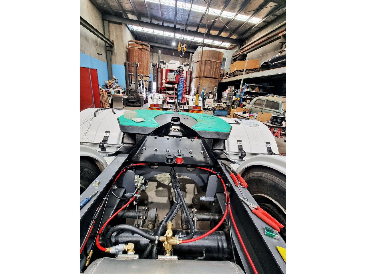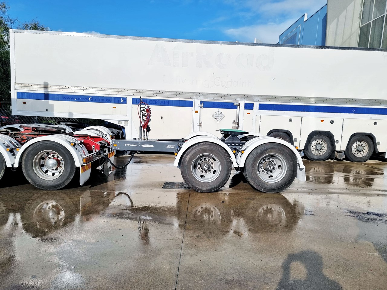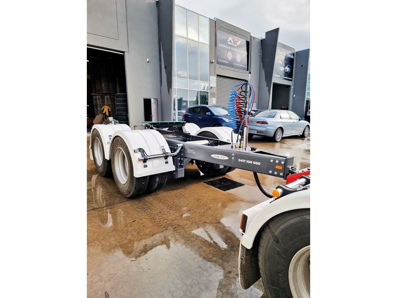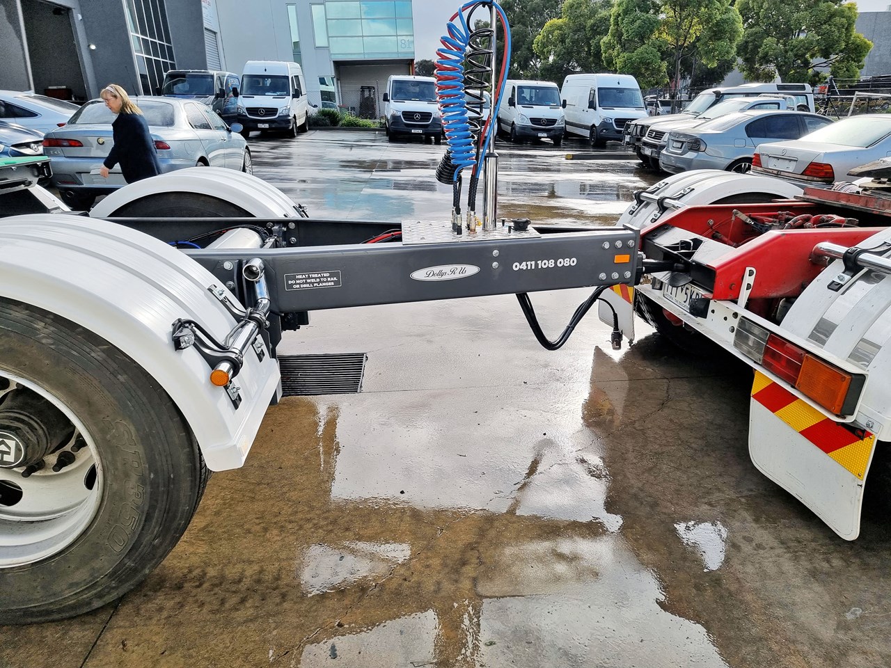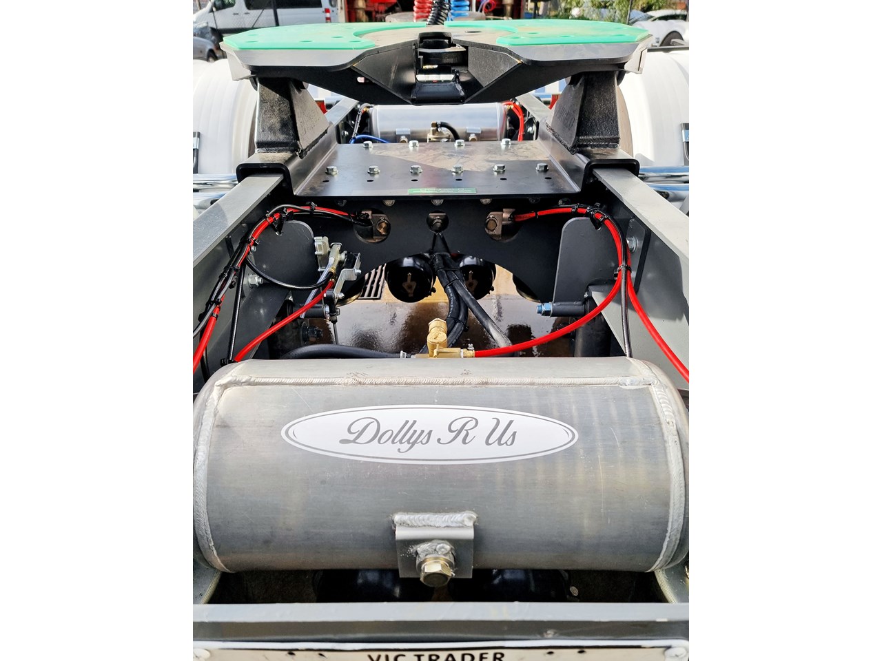 These are New dollys made to our own design with a rigid draw bar as we believe they are the safest and most durable as our dollys are all bolted to avoid cracking and down time and it gives them a very light tare weight and massive strength, and have anti sway benefits for the second or third trailer, they are designed for robust use. They were made for Dollysrus. For Hire or Buy.