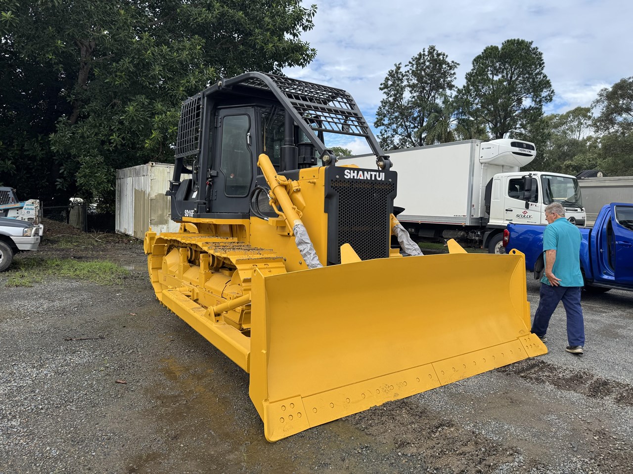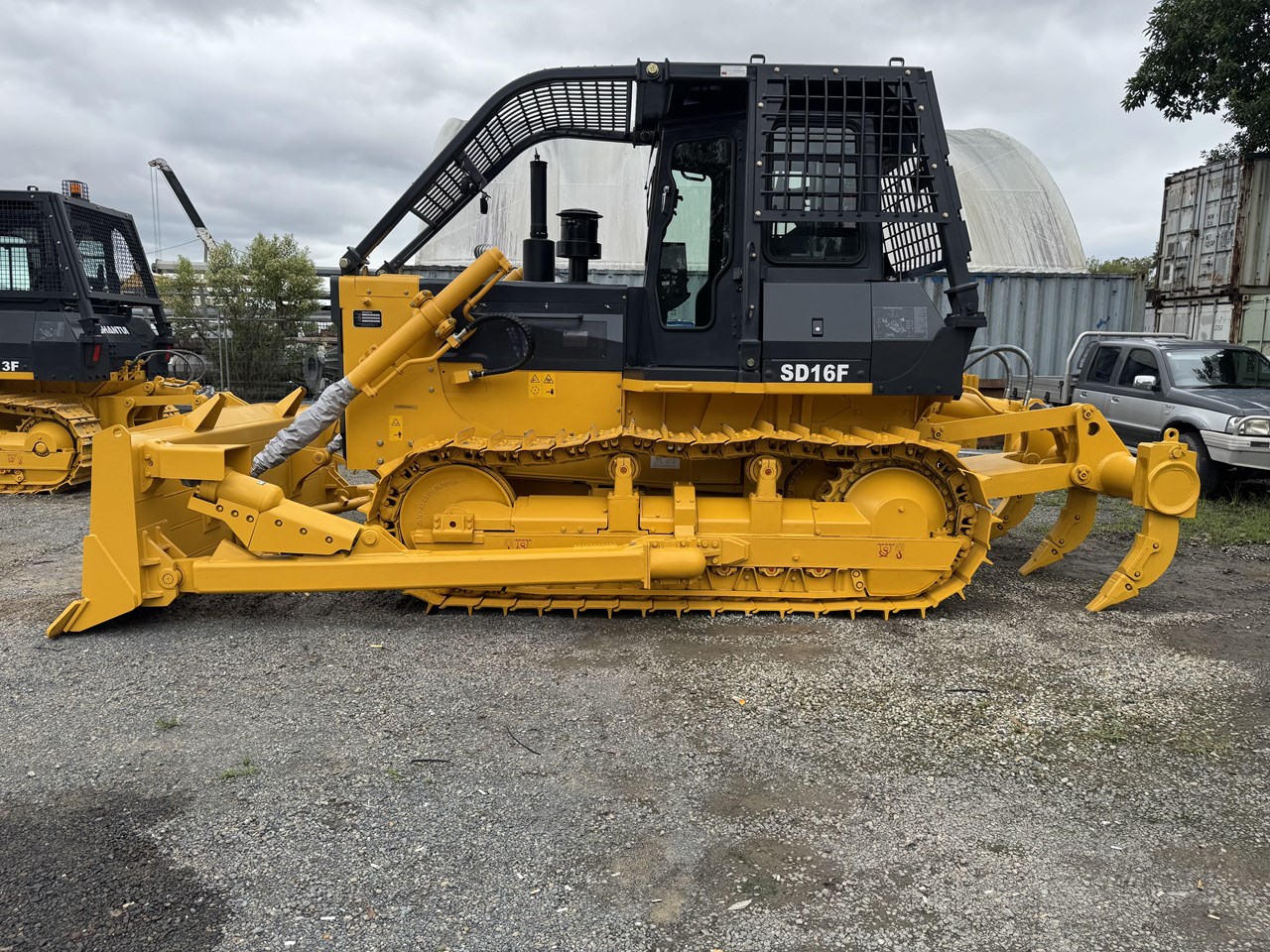 Shantui SD16F - 17.5 tonne (approximately with forestry) bulldozer with Shangchai SC11CB184G2B1 (cat) 131kW (175hp) 1850rpm engine, powershift transmission - 3 forward 3 reverse, straight tilt or angle blade, three shank rippers or winch, engine side guards, 560mm wide track shoes and track guard plate, ROPS/FOPS air-conditioned cabin with forestry protection, radio, and suspension seat.